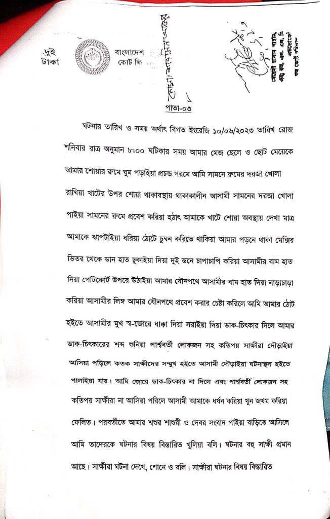 আসামী সামনের দরজা খোলা পাইয়া সামনের রুমে প্রবেশ করিয়া হঠাৎ আমাকে খাটে শোয়া অবস্থায় দেখামাত্র আমাকে ঝাপটাইয়া ধরিয়া ঠোঁটে চুম্বন করিতে থাকিয়া আমার পরনে থাকা মেক্সির ভিতর থেকে ডান হাত ঢুকাইয়া দিয়া দুই স্থানে চাপাচাপি করিয়া আসামির বাম হাত দিয়া পেটিকোট উপরে উঠাইয়া
