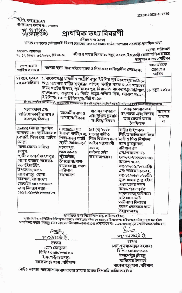 বাদী মোসাঃ শারমিন আক্তার(২৮) স্বামী রাসেল বেপারী, পিতা মোঃ হাবিব মোল্লা, মাতা মোসাঃ নাসিমা বেগম, স্থায়ী ঠিকানা, গ্রাম পূর্ব মহেশপুর বাংলাবাজার সংলগ্ন, ডাকঘর বড় পুই য়াউটা, থানা বাকেরগঞ্জ, জেলা বরিশাল।